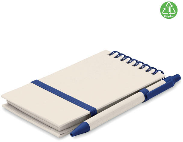 A6 spirálozott jegyzetfüzet. 70 sima lap, 70% újrahasznosított tejesdobozból és 30% újrahasznosított papírból. Hozzáillő nyomógombos golyóstoll, kéken író betéttel. Elasztikus zárópánt és tolltartó hurok.