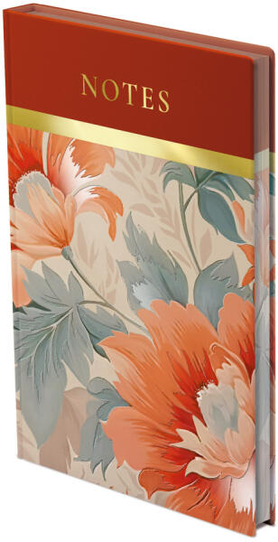 Színes grafikákkal díszített, matt fóliával bevont, csontszínű tömbös jegyzetfüzet, jelzőszalaggal.